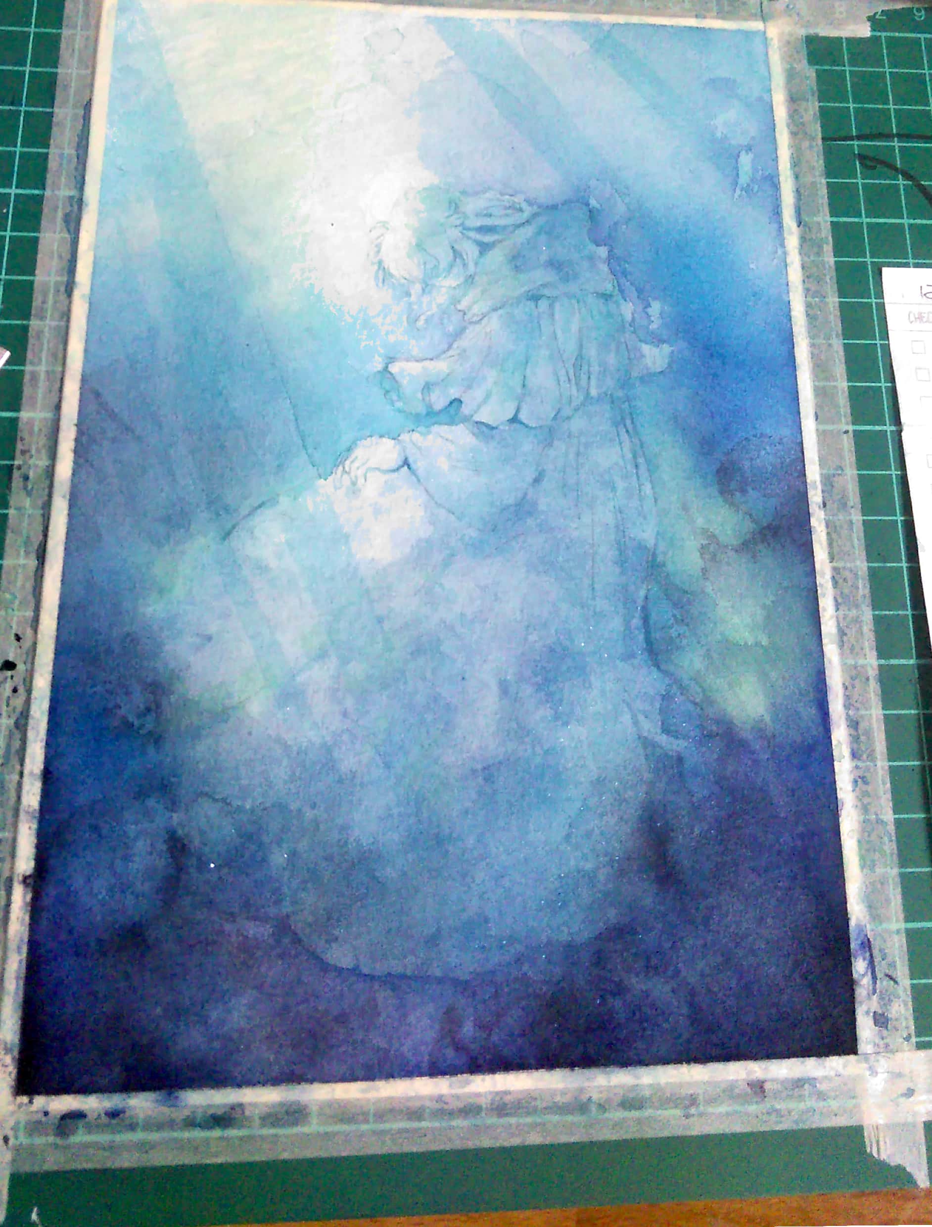 紙は重ね塗りしていくことと、星海の温かな海を描きたかったので、ウォーターフォードのナチュラルで。